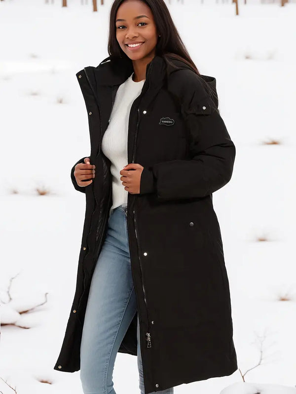 Schwarzer langer Wintermantel mit Kapuze für Damen – isolierend und bequem